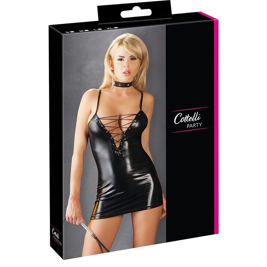 Rochie minunată, lucioasă, cu șireturi provocătoare pentru priviri tentantă peste decolteu. Cu bretele reglabile.