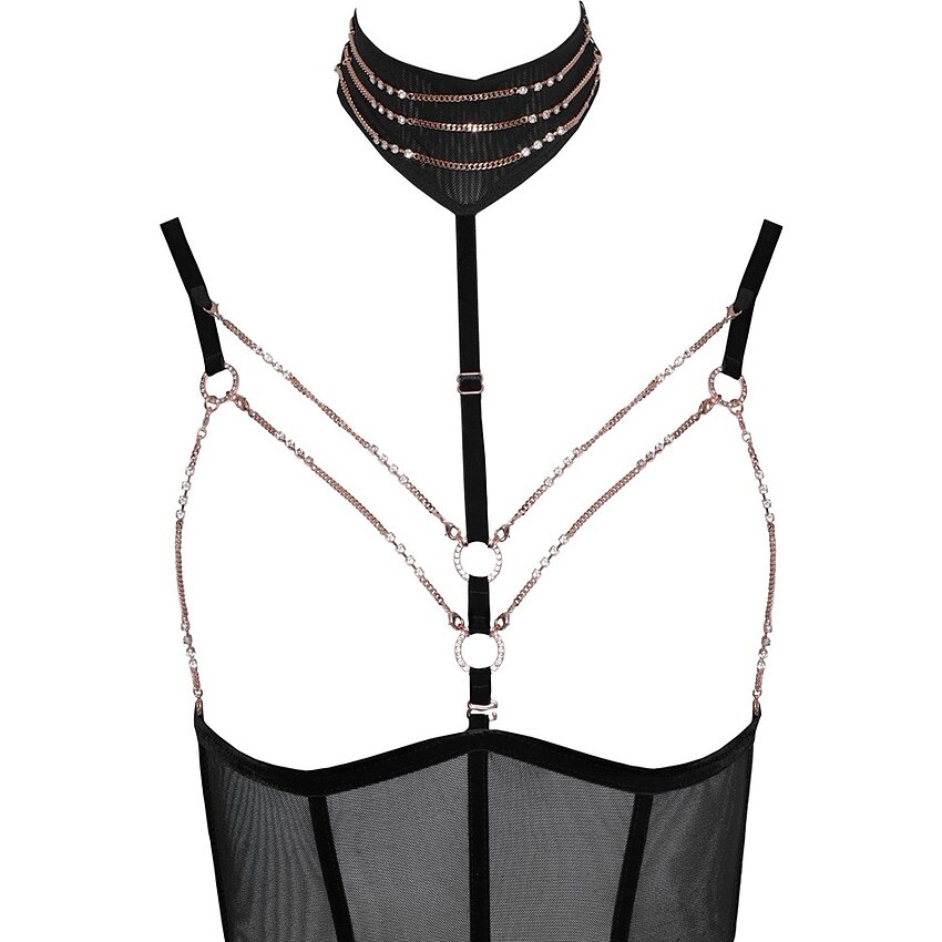 In stoc- Este concretizat din curele elastice acoperite cu țesături, care au știfturi pe ele. - Cele 2 lanțuri metalice detașabile trec peste picioare pentru a adăuga acea atingere sexy ținutei. Body-ul este ideal pentru sesiuni intense de bondage, oferind o experiență captivantă și incitantă. - Jocurile fierbinți de bondage pot fi savurate cu acest body negru cu curele.