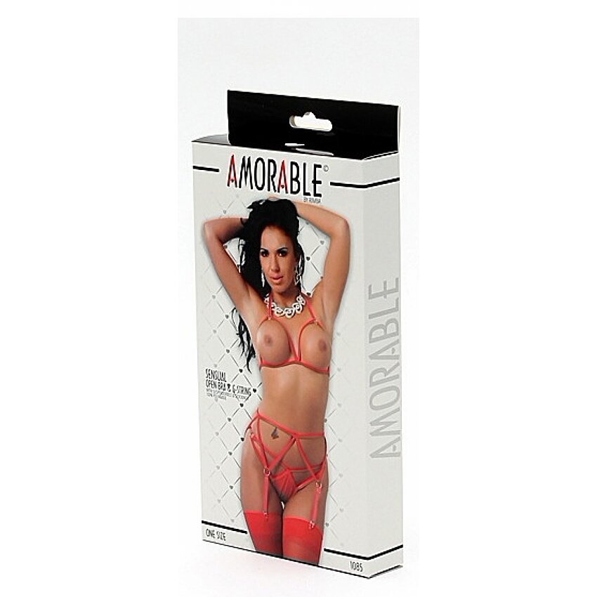 - Setul conține un bustieră deschis care lasă sânii la vedere, cu un mic inel metalic între sâni de unde pornesc bretele elastice. - Tanga este deschisă în față și are bretele, permițând acțiuni rapide excluzând a fi nevoie să fie dată jos. - Portjartieră din volănaș are bretele ajustabile pentru ajustarea lungimii. - Bretelele sunt elastice pentru confort maxim. - Sutienul are detalii cu bretele în zona decolteului și fante incitante în cupe, accentuate de un inel decorativ. - Cele două piese au un sistem practic de închidere cu clips la spate.