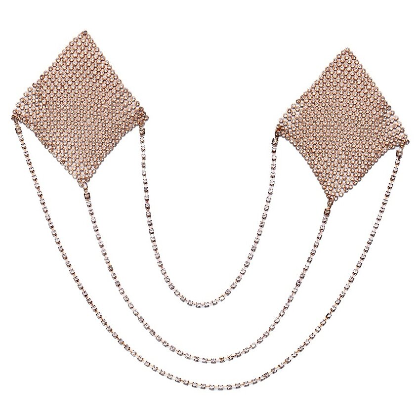 Stickers-urile pentru mamelon Cottelli, de culoare aurie, sunt piese decorative atrăgătoare, deținând modele strălucitoare și sclipicioase în stil diamant. Fiecare sticker măsoară 6.5 cm x 6.5 cm și este dotat cu trei lănțișoare delicate. Pot fi reutilizate prin încorporarea foliei protectoare cândva de depozitare. Realizate din ABS, sticlă și metal, sunt prietenoase cu pielea și folosesc lipici bio-adeziv.