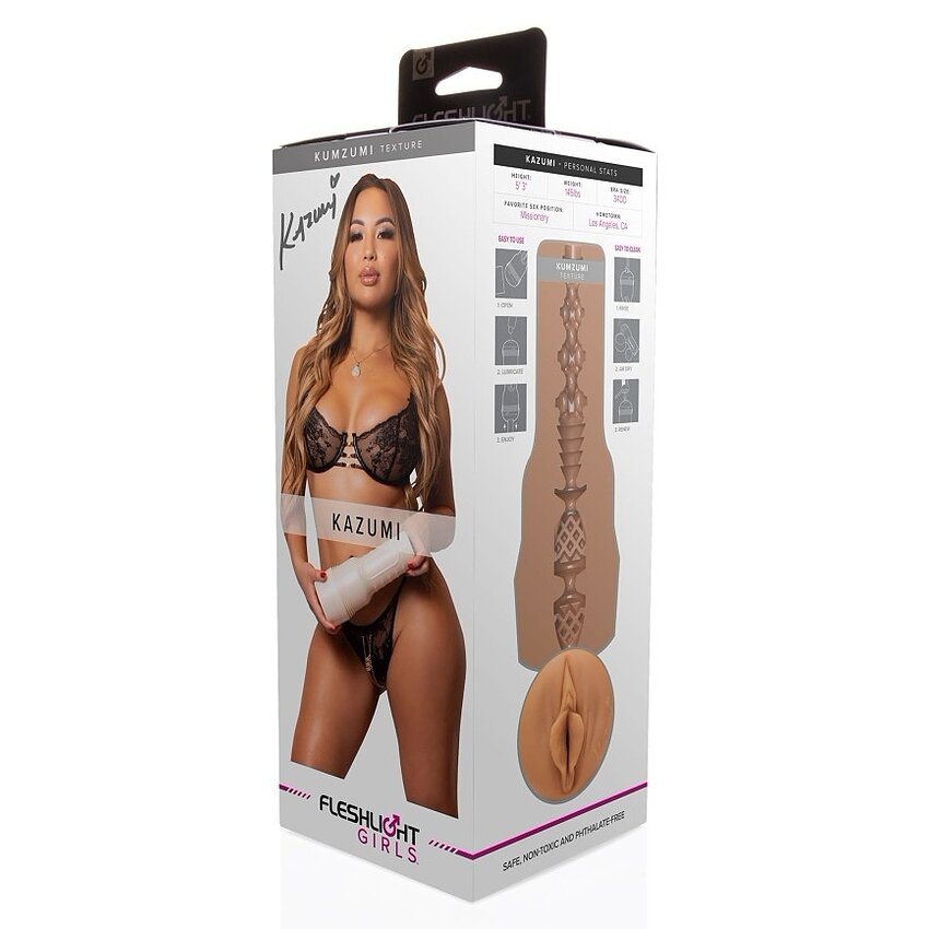 - Fleshlight Kazumi este o replică realistă a vaginului celebrei creatoare de conținut și vedete adulte, Kazumi. - Masturbatorul are deschiderea modelată după vaginul autentic al starului adult Kazumi. - Manșonul interior are autograful lui Kazumi lângă deschidere.