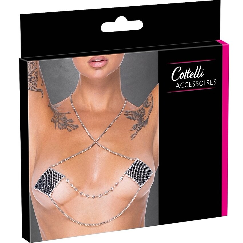 Stickere pentru sâni, pătrate 5,5×5,5 cm, finisaj argintiu cu cristale negre. Două lanțuri pendulare și un lanț central, unul decorat cu rhinestones. Adeziv bio-prietenos, reutilizabile cu film protector. Sigur, discret și fără greutate — greutate copleșitoare 54 g.