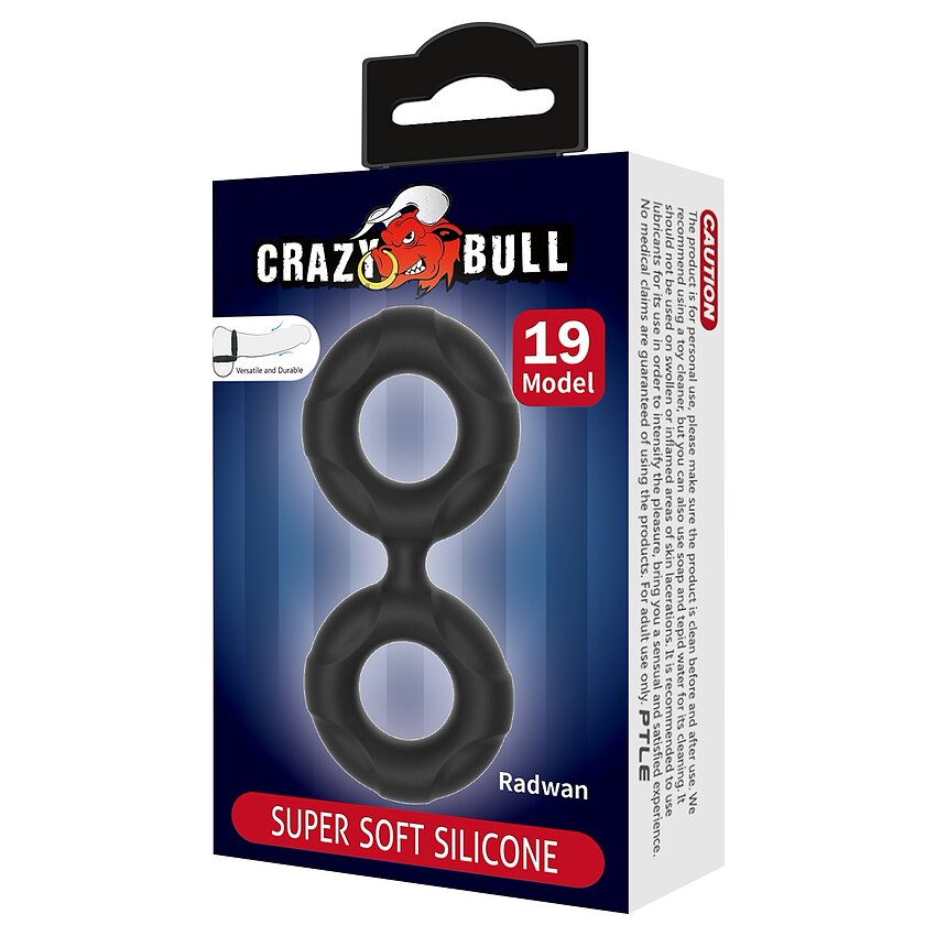 Inel dublu din silicon super-moale Crazy Bull Radwan Model 19, creat pentru sprijinire și fermitate prelungită. Se potrivește confortabil pe ax, ajutând la amânarea climaxului și la intensificarea plăcerii, excluzând ingrediente vibrante.