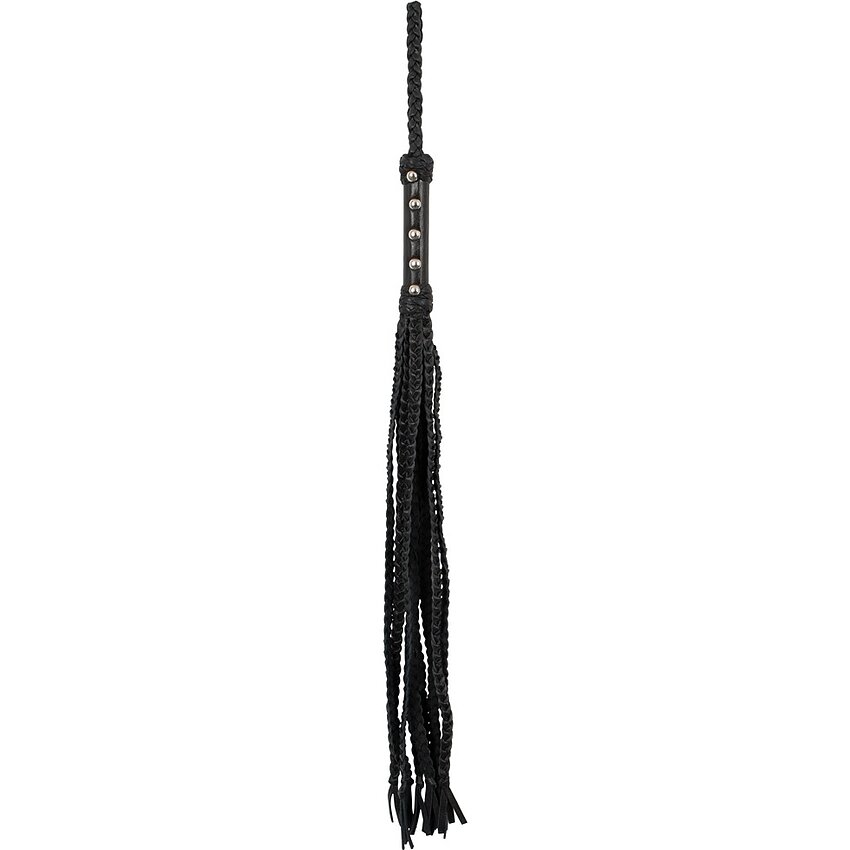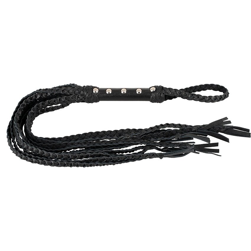 Flogger ZADO Cat‑O‑Nine cu 9 cozi împletite din tegument naturală, ansamblu de prindere cu nituri și buclă pentru încheietură. Lungime necondiționată 70 cm (fără buclă). Design robust pentru control precis și senzații variate.