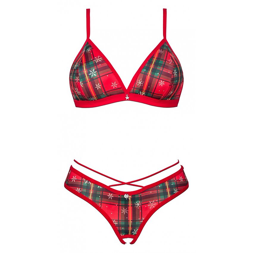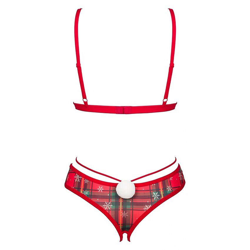 Set Ms. Merrilo de la Obsessive: sutien fără armătură și bikini decupat, din tulle elastic cu model în carouri și fulgi albi. Bretele reglabile, pandantiv aurit și pompon pufos la spate. Confort catifelat și potrivire elastică.