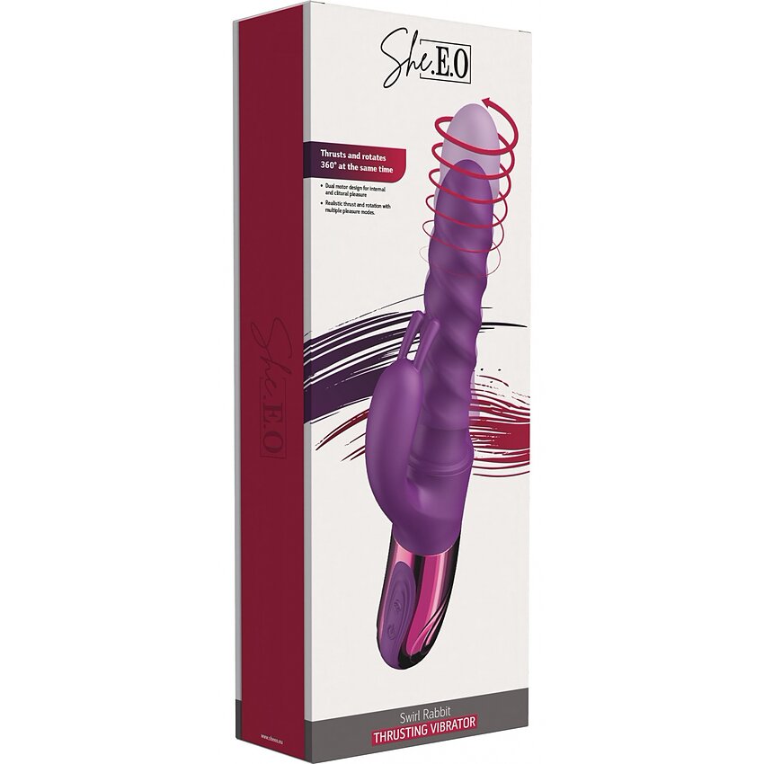 Swirl Rabbit de la She EO combină o rotaţie completă de 360° cu un mecanism de împingere pentru stârnire internă puternică și ritmică. Shaftul inserabil se roteşte în jurul axei în timp ce execută mișcări sus-jos, imitând o senzație dinamică și controlabilă.