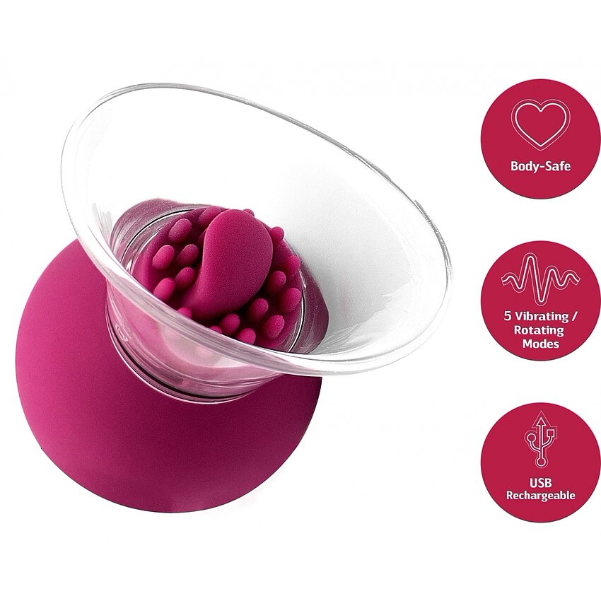 Beneficii și atribute: - Incită punctual clitorisul și mameloanele cu cupuri dedicate (Ø clitoris 6 cm, Ø mamelon 4.5 cm) - Aspiraţie controlată manual prin bulb pentru senzaţii mai precise - Motor care se rotește + vibrator, fiecare cu 5 moduri pentru varietate - Reîncărcabilă USB C pentru convenienţă - Materiale sigure pentru corp; componente electrice nu sunt impermeabile - Curăţare comodă cu o cârpă umedă (nu se scufundă în apă)