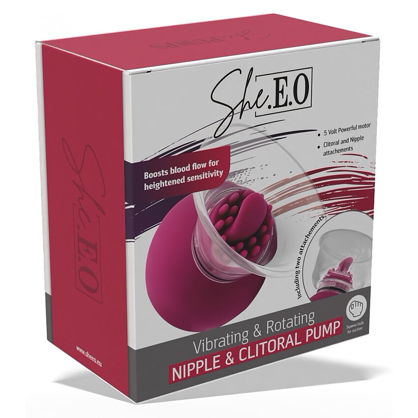 Pompa She EO Rotativă și Vibrantă oferă stârnire precisă pentru clitoris și mameloane prin două cupuri detașabile și sistem de aspirație manual. Designul compact (8 x 8 x 8 cm) combină motorul rotativ și vibratorul pentru control fin al intensității.