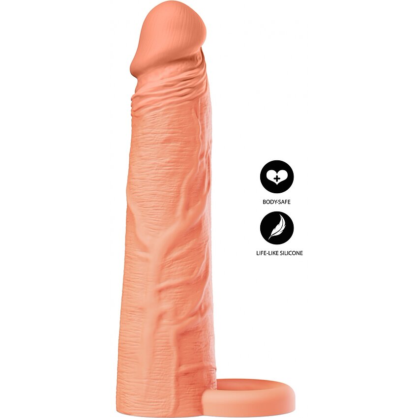 Manșon extensie din silicon lichid, 20 cm, texturat cu vene și cap pronunțat. Inserabil 18 cm, diametru 3.5 cm, inel integrat de 4 cm pentru stabilitate și ventuză pentru fixare. Material sigur pentru corp, textură moale și realistă — pentru volum și susținere.