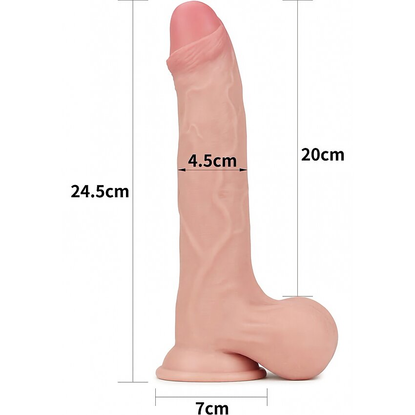 Dong 24.5cm din material Sliding Skin strat dublu: exterior moale şi miez ferm pentru senzaţie naturală. Confecționat manual, flexibil, include testicule complete. Corespunzător cu lubrifianţi pe bază de apă; curăţare uşoară.