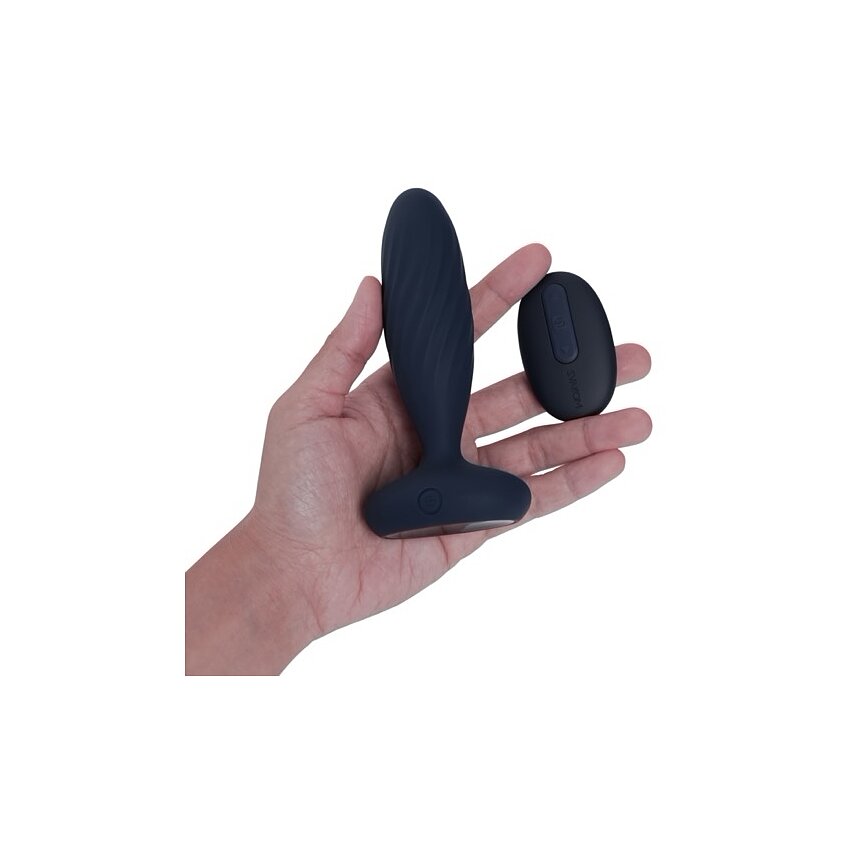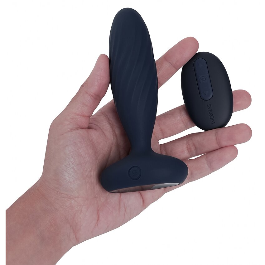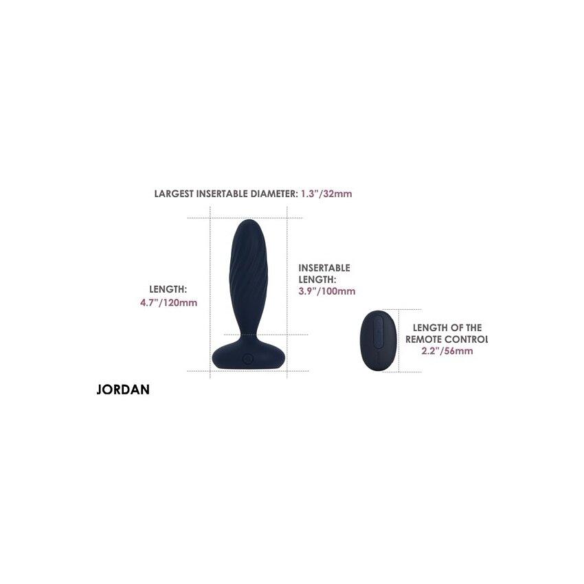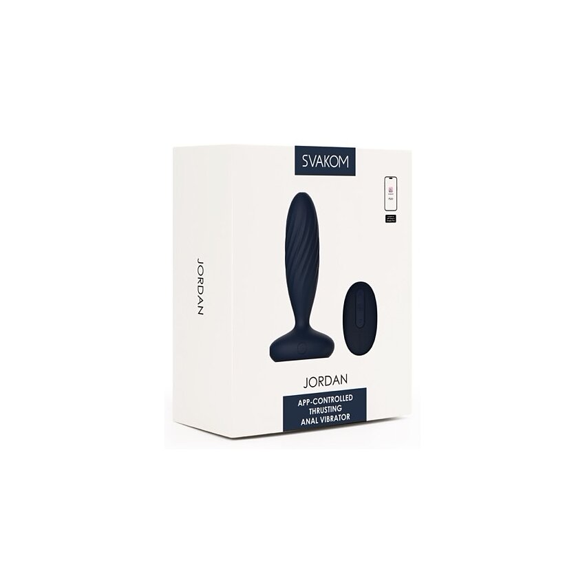 Jordan de la Svakom, vibrator anal cu acumulator cu împingere şi vibraţie combinate. 7 moduri x 5 niveluri. Control prin aplicaţie SVAKOM sau telecomandă magnetică. Bază iluminată, memorie şi blocare pentru călătorii. Insertabil 10 cm, calibru 3.2 cm.