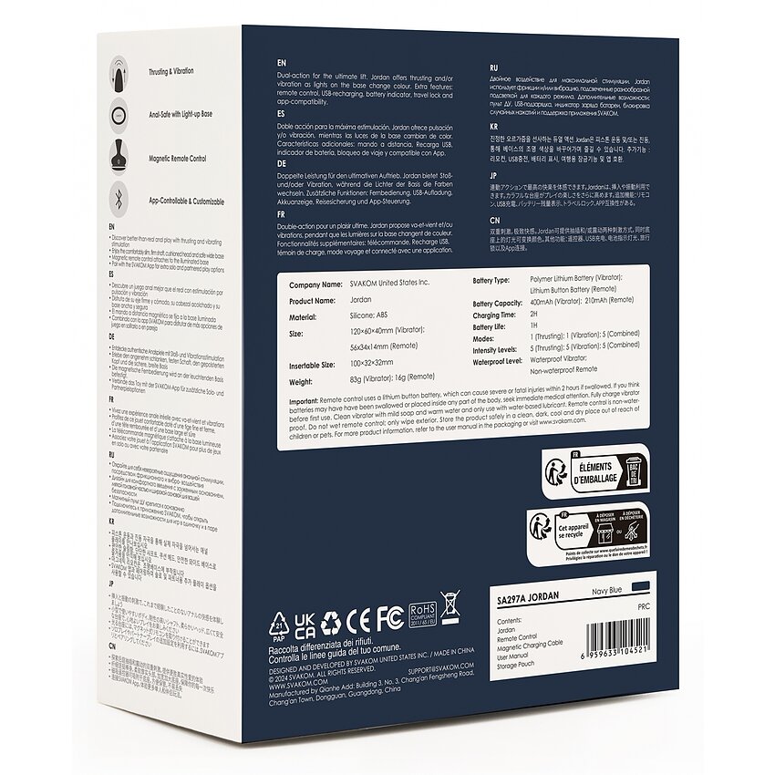 Control flexibil: Jordan poate fi operat prin aplicaţia SVAKOM sau cu telecomanda magnetică fixată de bază. Oferă 7 moduri (1 de împingere, 1 de vibraţie şi 5 combinate), fiecare cu 5 niveluri de intensitate. Se află şi un mod inteligent care imită ritmuri naturale. Telecomanda nu este rezistentă la apă.