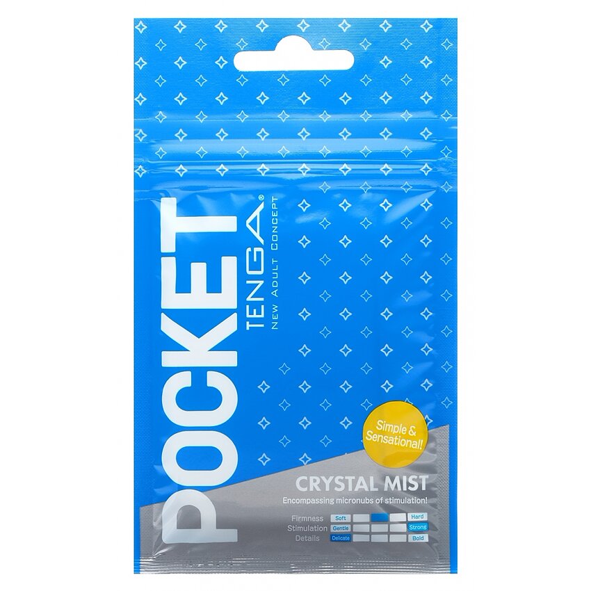 Pocket TENGA Crystal Mist, masturbator compact din TPE cu interior cu particule fine pentru stârnire fermă și constantă. Ambalaj zip sigilat, de unică folosință. Discret, igienic și ușor de transportat.