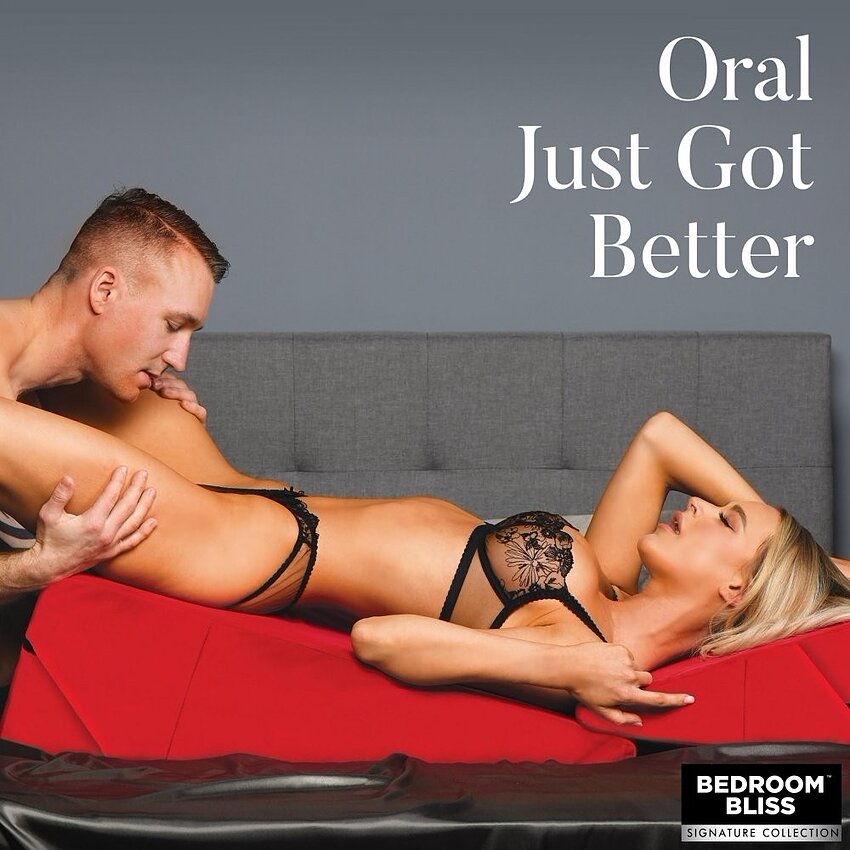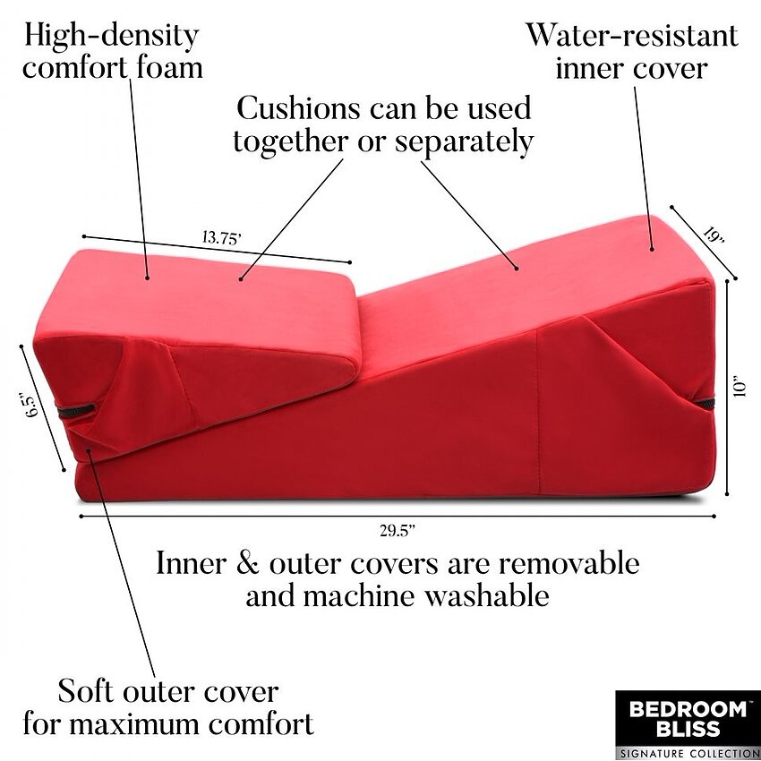 Set ergonomic Mistress: pernă și lounger din poliester, colorit roșu. Se pot utiliza laolaltă sau separat, oferind până la 20 poziții. Pernă 48.2×35×16.5 cm; lounger 75×48.6×25.4 cm.