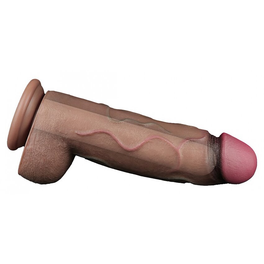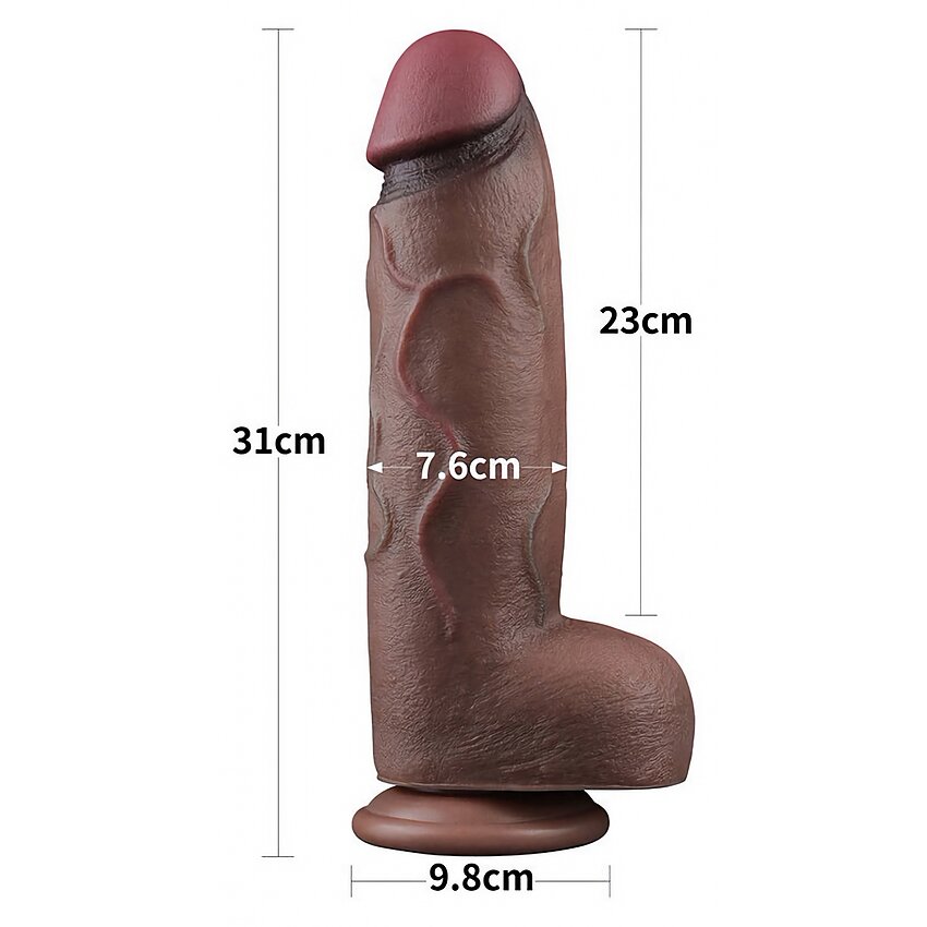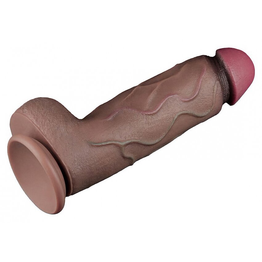 Realist Lovetoy din silicon cu două straturi — 31 cm total (23 cm inserabili), diametru 7.6 cm. Cap rotunjit, textură discretă și bază cu ventuză pentru stabilizare hands-free. Colorație maro. Ușor de curățat.