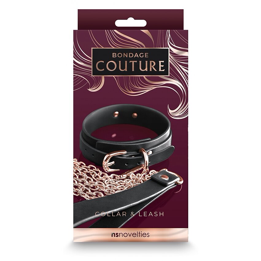 Set zgardă și lesă Bondage Couture de la NS Novelties, reglabil, din imitație de piele și metal fără nichel. Stil cu bun gust auriu-negru, lesă întinsă pentru control discret. Potrivit pentru începători și colecții fetish.