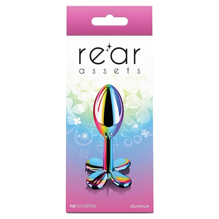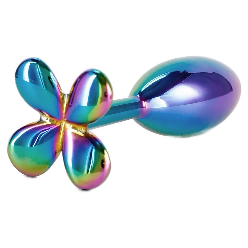 Dop anal metalic NS Clover, finisaj cromat multicolor. Bază în siluetă de trifoi cu 4 foi, estetică compact și ușor, sigur pentru corp. Aluminiu neted, corespunzător cu orice lubrifiant, ușor de curățat — grozav pentru începători.