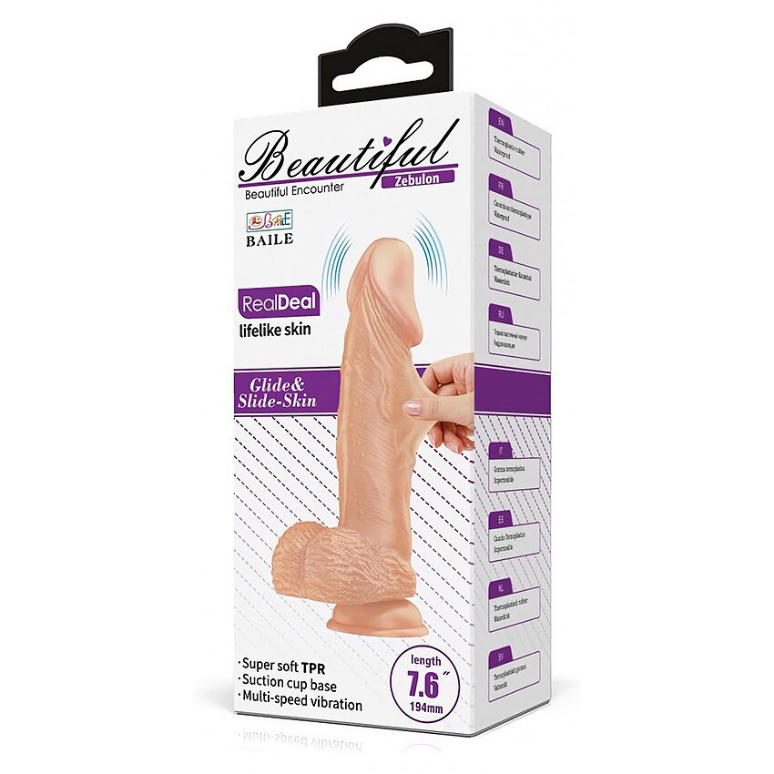 Vibrator realist Pretty Love Zebulon, 19,4 cm: exterior din TPR moale și miez ferm, ventuză puternică pentru utilizare hands-free și tele-comandă cu fir pentru reglaj fin al vibrațiilor. Waterproof, curățare ușoară.