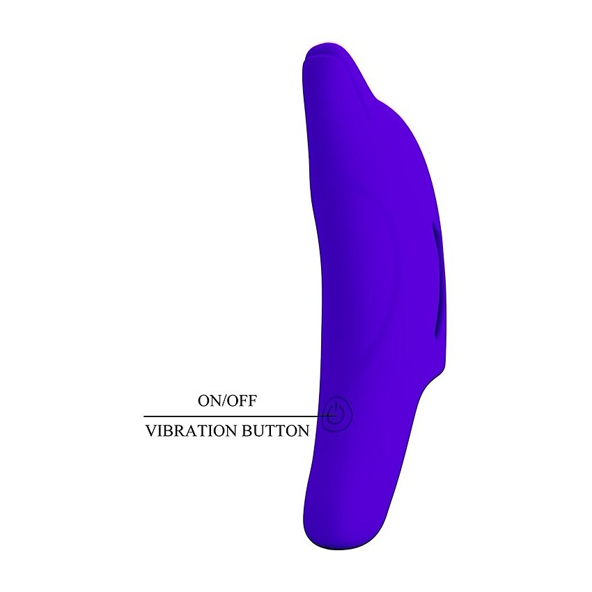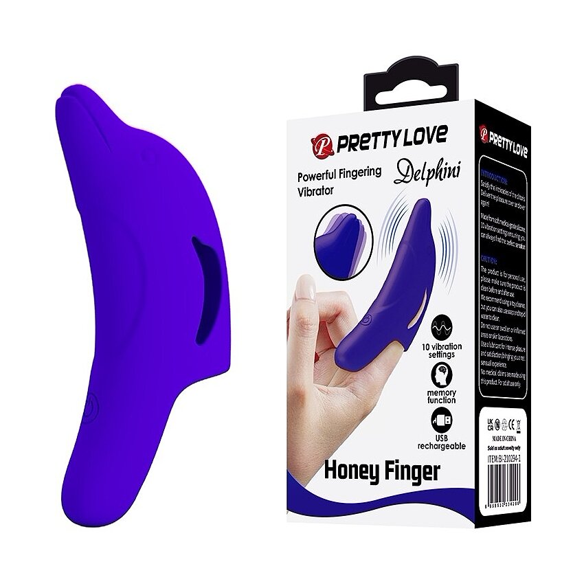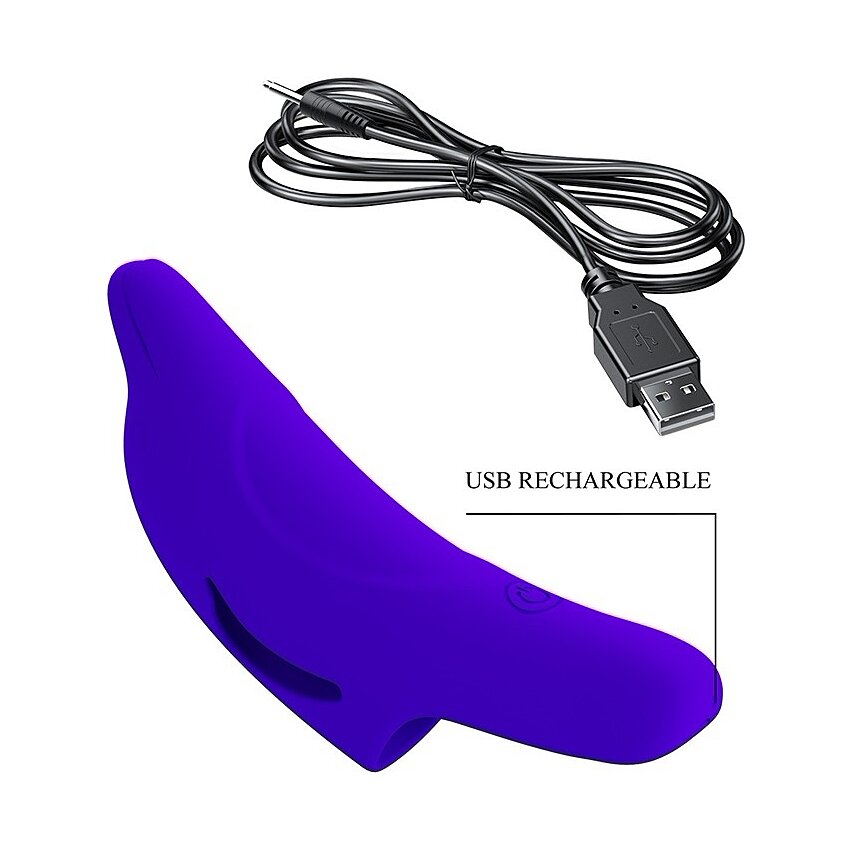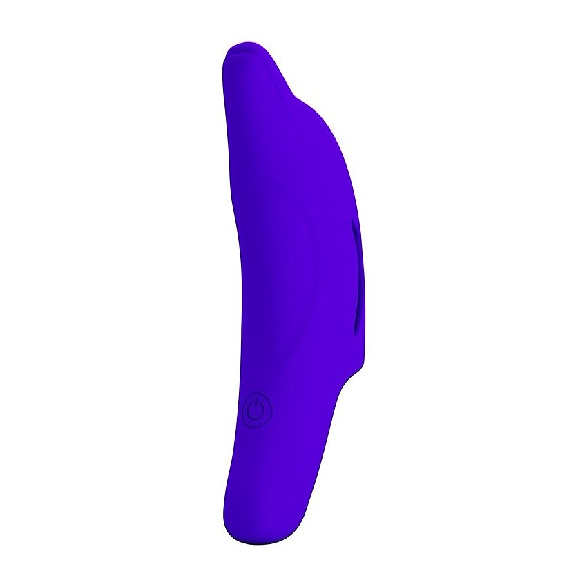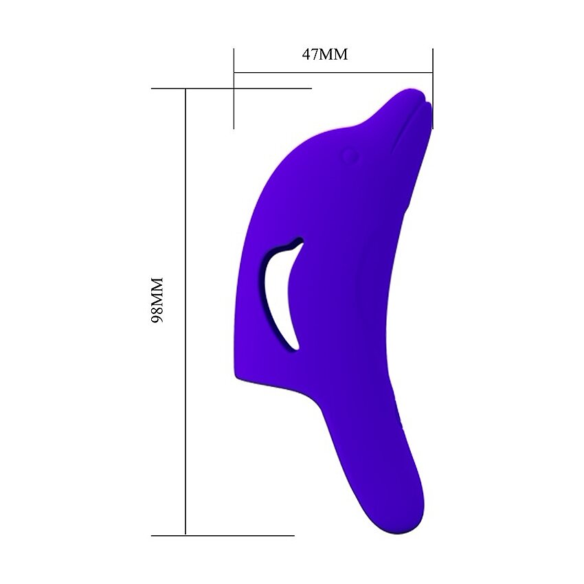 Vibrator slip-on din silicon Pretty Love Delphini, cu 10 moduri de vibraţie. Vârf înclinat şi texturat pentru stimulare precisă, se fixează pe deget pentru control bun. Compact, ușor de curățat și discret.