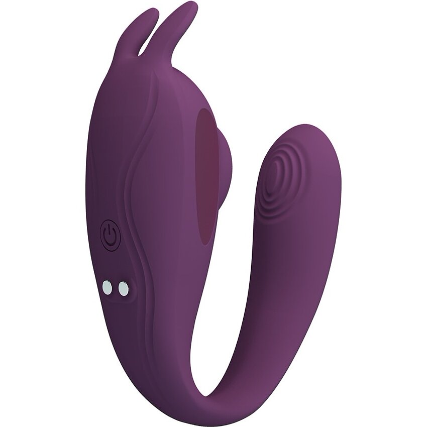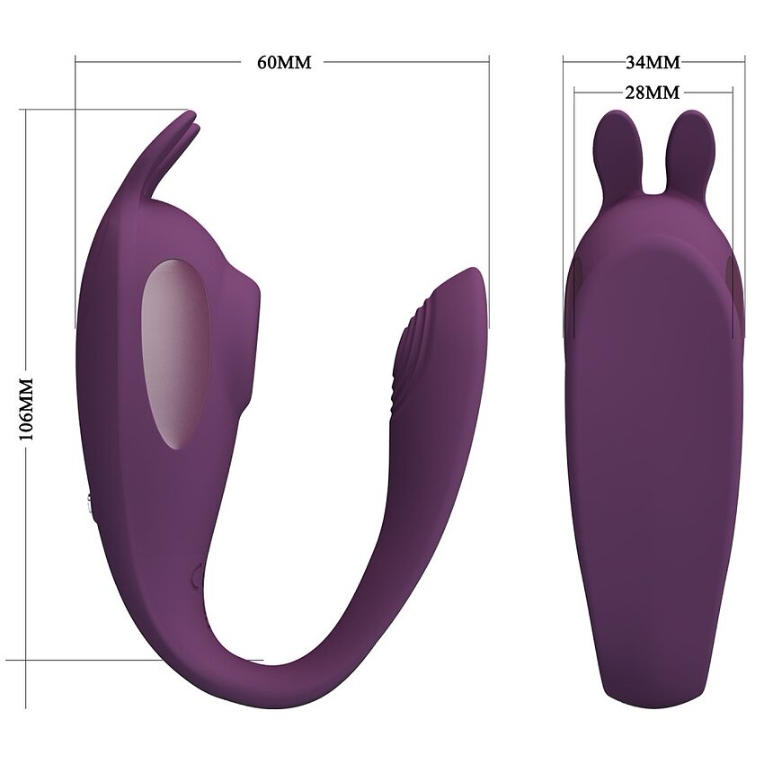Pretty Love Shey este un stimulator compact, proiectat în aspect de C pentru a se adapta natural contururilor trupului și a dărui stabilitate în momentul utilizării. Fiecare braț are rol dedicat: unul pentru stimulare externă (10 setări de pulsații), celălalt pentru stimulare internă la nivelul punctului G (10 moduri de vibrație).