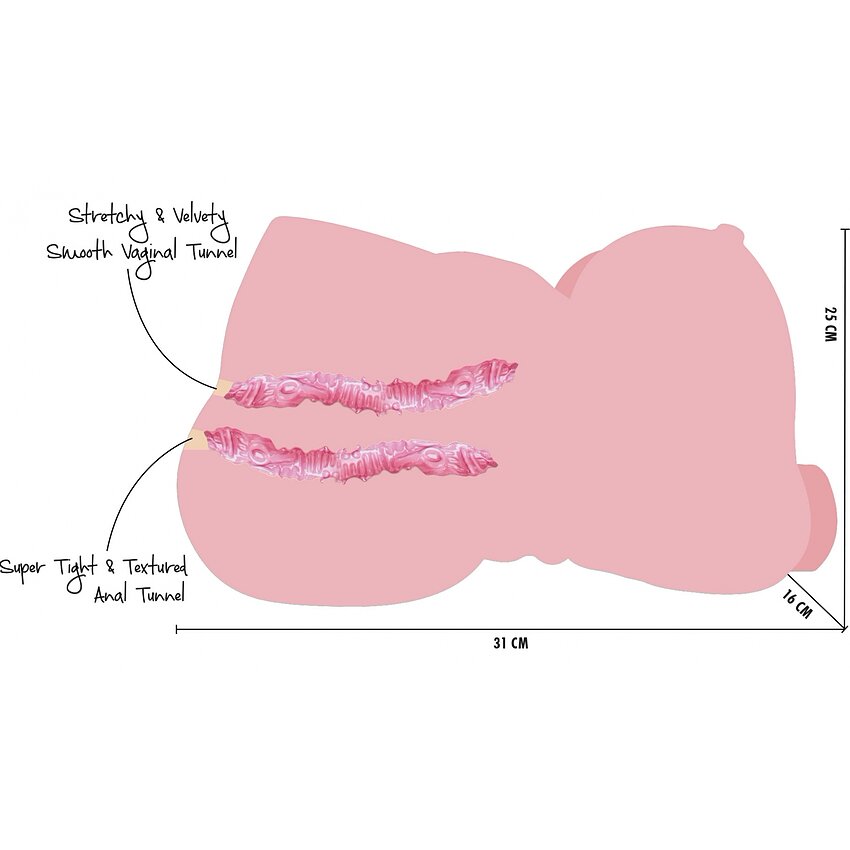 Beneficii și atribute: - Material: Realistic Love Skin, moale și flexibil - Canal intern texturat pentru stimulare variată - Detalii exterioare realiste și configurație voluptuoasă - Greutate indicativă: 6 kg - Ușor de curățat; recomandat agent de ungere pe bază de apă - Ambalaj discret și păstrare sigură
