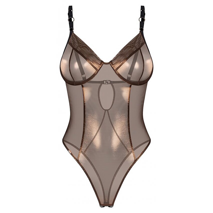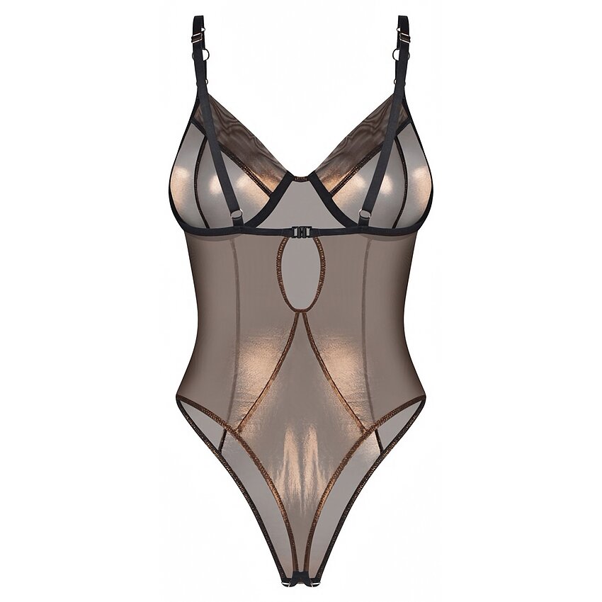 Body Soranna asigură un finisaj bronze, ușor translucid, cu o sclipire discretă care avantajează linia corpului. Designul în stil tanga, cu tăietură înaltă și decupare inghinal, subliniază silueta lipsit de a sacrifica confortul.