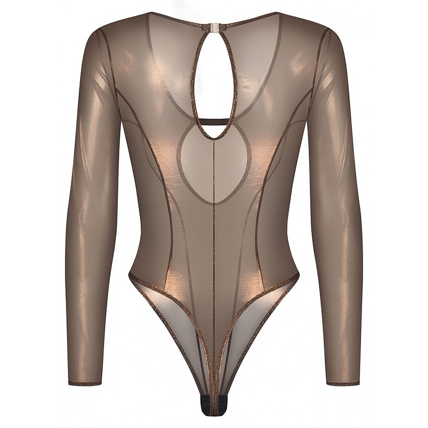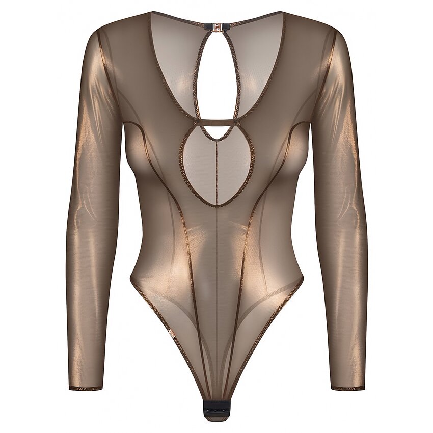 Body Soranna de la Obsessive atrage priviri prin nuanța bronz cu un ușor luciu elegant. Croiala tip thong și tăietura înaltă a piciorului alungesc silueta, iar decupajele dau o notă rafinată.