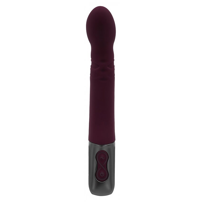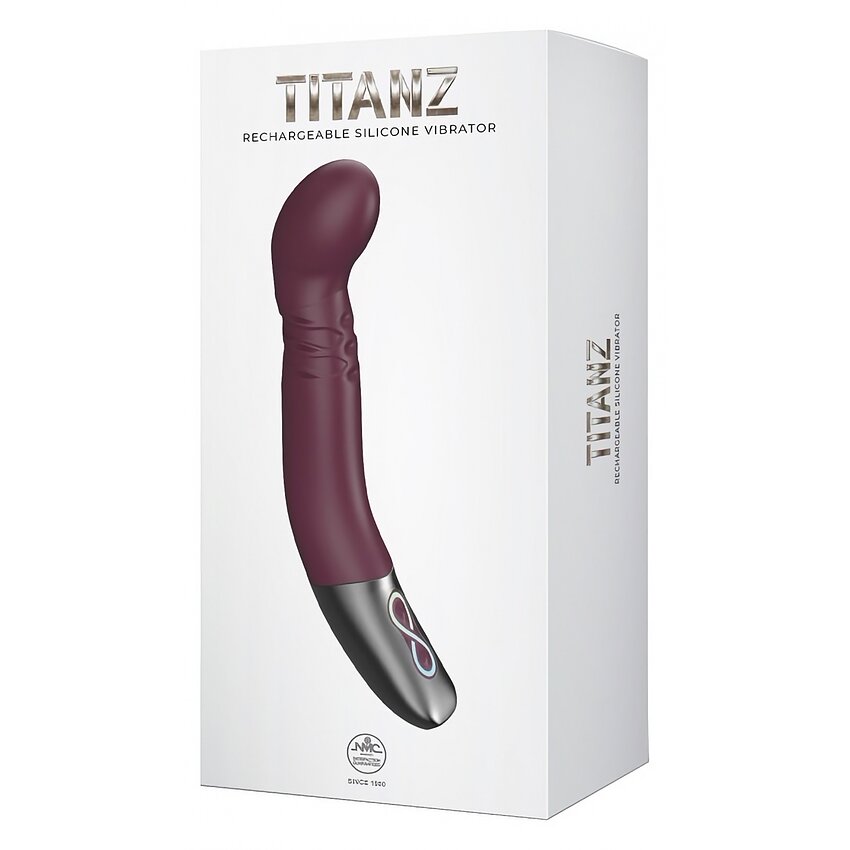 Vibrator Titanz Rubine Red din silicon premium: cap rotativ cu 10 aplicații de vibrație și 10 de rotație, reîncărcabil și rezistent la apă. Mâner metalic, butoane LED și regiune ușor texturată pentru stimulare punct G.