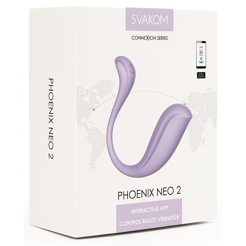 Vibrator compact SVAKOM Phoenix Neo 2 Pastel Lilac: 2 motoare puternice, 11 moduri de vibraţie, LED reglabil, control prin aplicaţie Bluetooth şi funcţie de control la distanţă. Reîncărcabil, durabil la apă, silenţios; conține cablu USB şi pouch pentru depozitare discretă.