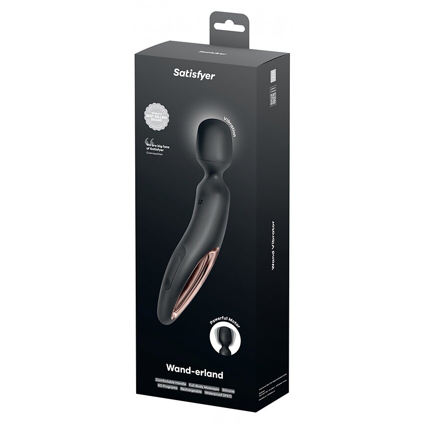 Satisfyer Wand-erland: wand reîncărcabil, 50 combinații de vibrații (10 ritmuri × 5 intensități), corp din silicon cu detalii ABS roz-auriu. IPX7 rezistent la apă, încărcare magnetică USB inclusă, ștergere ușoară. Adecvat pentru masaje corporale relaxante.