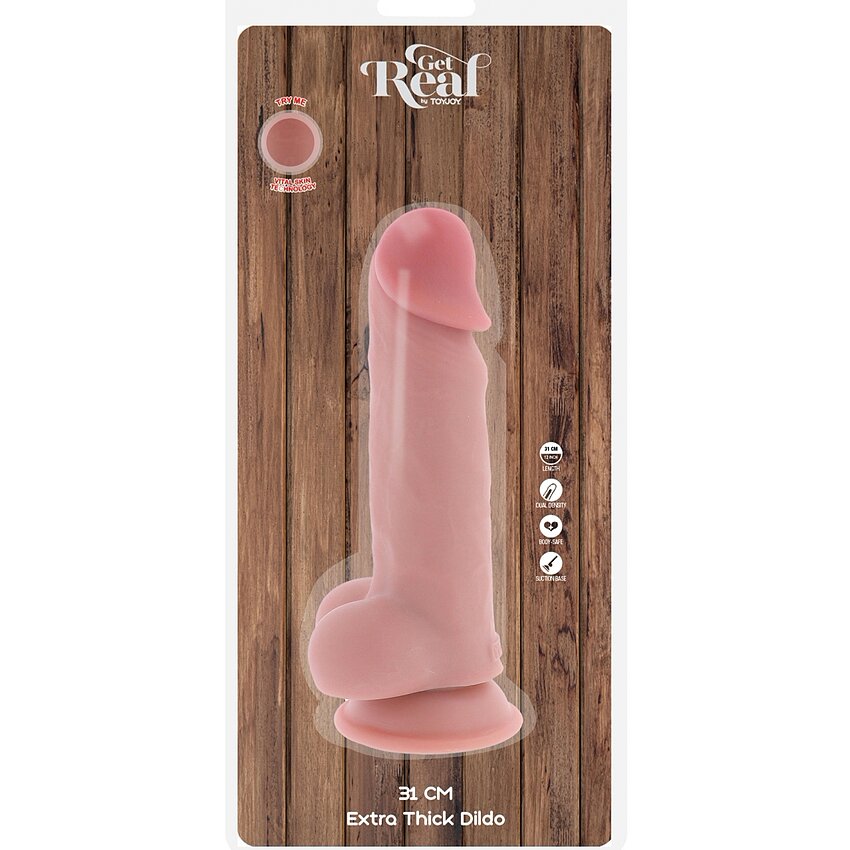 Replică autentică Get Real Deluxe de la ToyJoy, dual-densitate, 31 cm, inserabil 25,5 cm și diametru 7 cm. Suprafață Supreme Skin TPE, bază cu cupă pentru exploatare hands-free. Compatibil cu lubrifianți pe bază de apă; ștergere lejeră cu apă caldă și săpun.