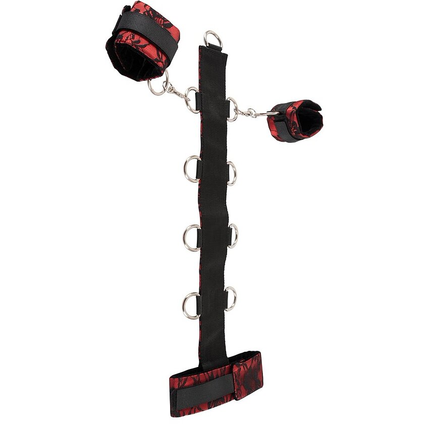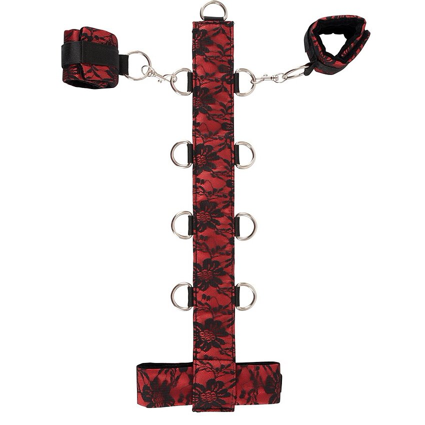 Beneficii și atribute: - Design elegant: mătase roșu combinat cu dantelă neagră - Interior din catifea pentru confort la purtare - Prindere reglabilă cu velcro pentru ajustare precisă - Cătușe cu carlige rapide pentru montare/demontare facilă - Material 100% poliester: durabil și ușor de întreținut
