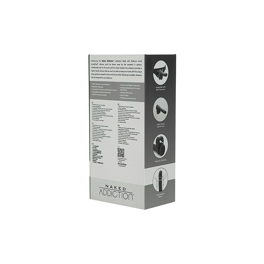 Stimulator care se rotește și de împingere Naked Addiction: cap rotativ, 7 chipuri vibrație și 7 viteze rotație/împingere, tele-comandă wireless. Silicon întărit cu platină, ventuză intensă pentru hands-free, reîncărcabil USB, autonomie ~60 min. Corespunzător strap-on.