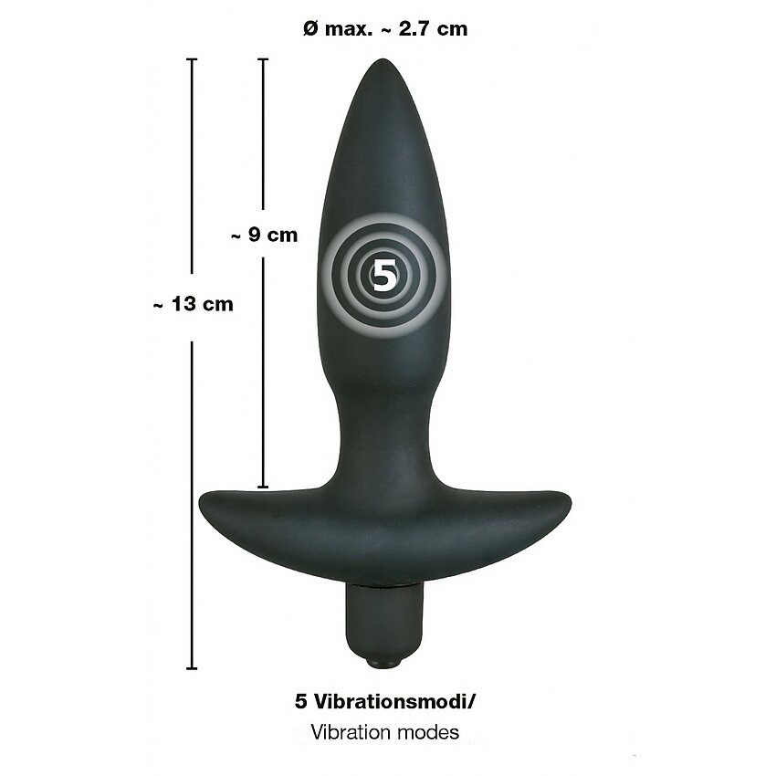 Plug anal mic You2Toys din silicon fără ftalați, 5 trepte de vibrație, foarte silențios, mâner retractabil. Lungime perfectă 13 cm, inserabil 9 cm. Alimentare 1 x AAA (nu este inclusă).