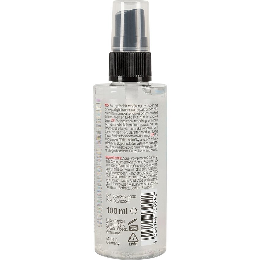 Beneficii și atribute: - Curățare adecvată pentru zona intimă și jucării - Soluție blândă, fără parfum - Include și nalbă, mușețel și aloe vera pentru calmare și hidratare - Vegan și testat dermatologic (FOARTE BUN 09/2021) - Nu corodează materialele sensibile și nu pătează - Exploatare rapidă: pulverizați, așteptați și ștergeți
