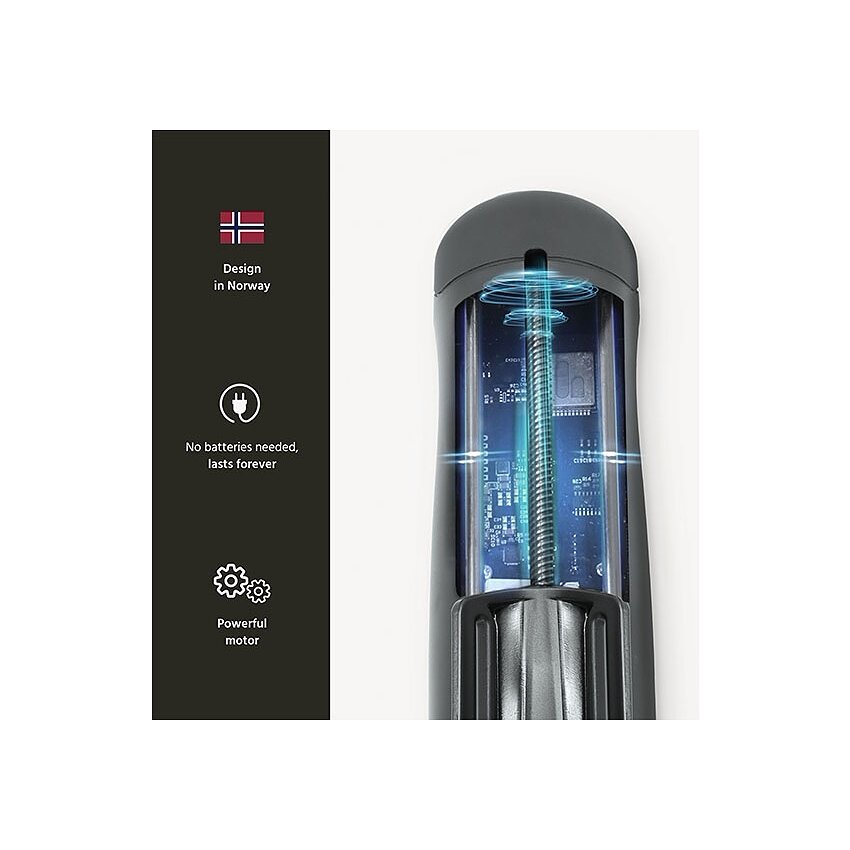 Manșonul TrueGrip, cu capăt închis, se fixează rapid și se curăță ușor: clătiți și întoarceți pe dos. Dispozitivul este alimentat la rețea și include adaptor unghi 90° pentru o instalare simplă.