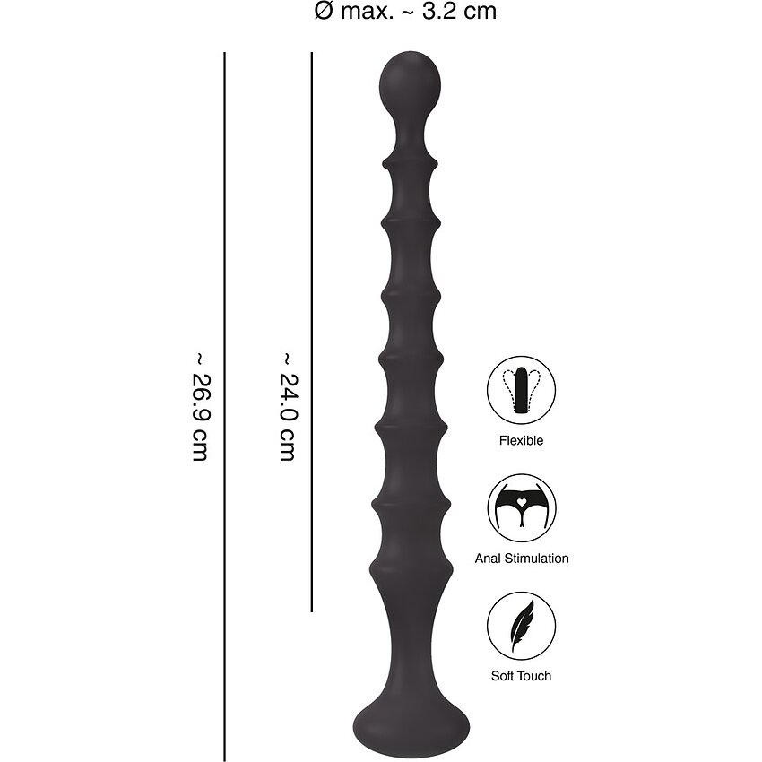 Lungime Totală: 26.9 cm Lungime Inserabilă: 24 cm Diametru: 2.5-3.2 cm Culoare: Negru Material: Silicon Livrare: Discreta Brand:You2Toys