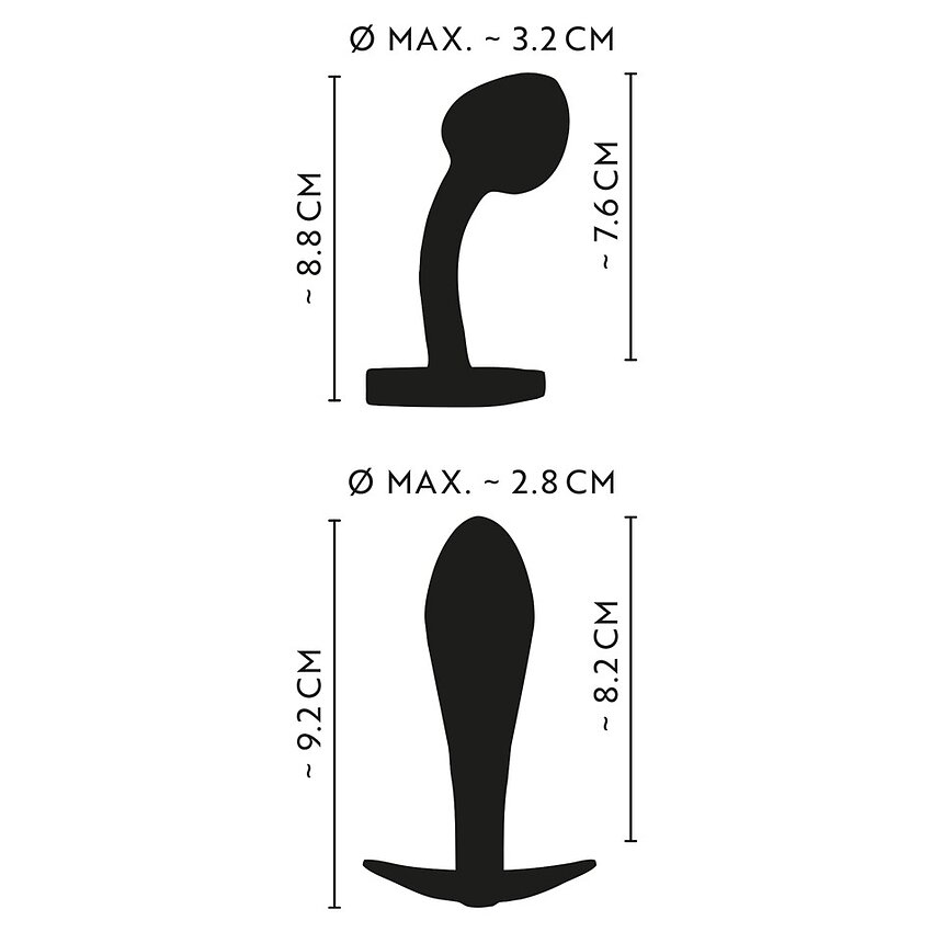 Dimensiuni și greutăți detaliate: - Plug drept: lungime completă 9.2 cm, mărime inserabilă 8.2 cm, calibru maxim 2.8 cm, greutate 81 g - Plug curbat: extindere desăvârșită 8.8 cm, lungime inserabilă 7.6 cm, diametru maxim 3.2 cm, greutate 75 g