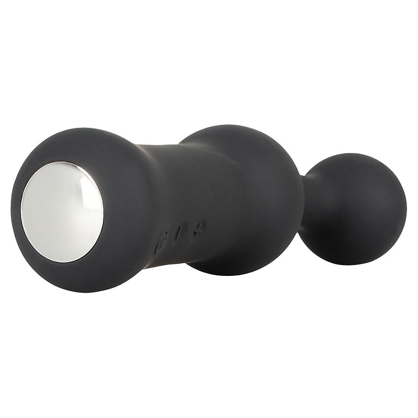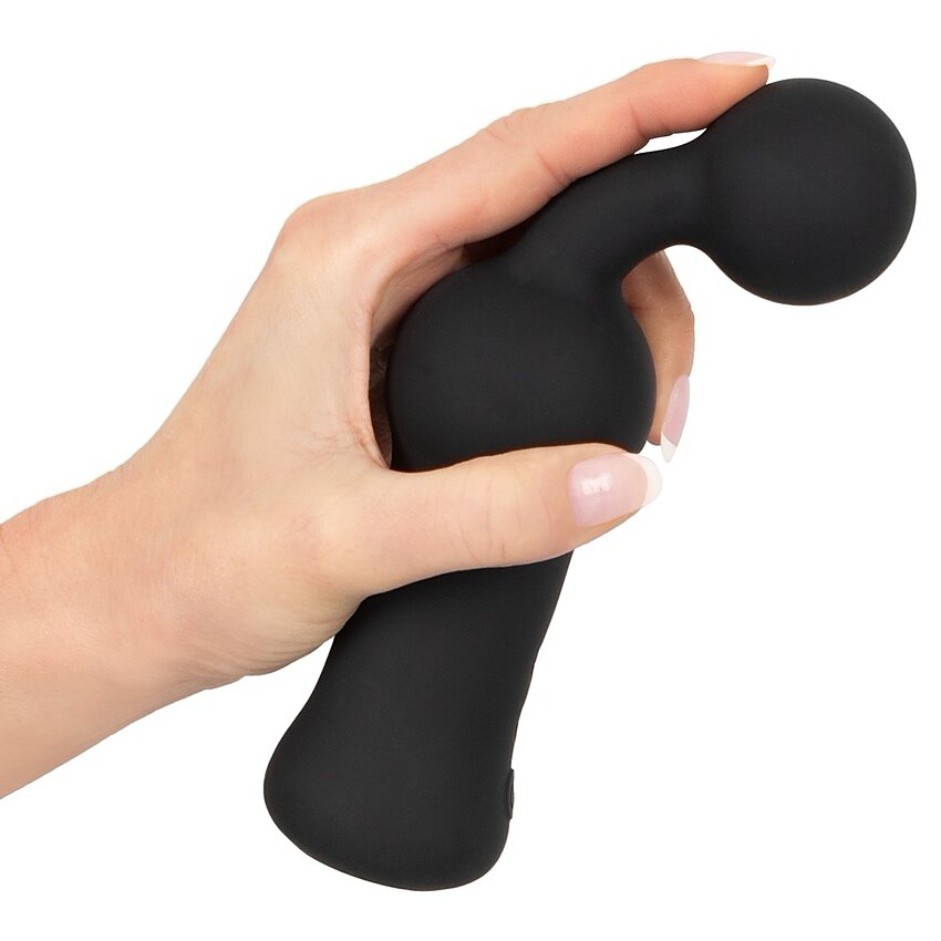Stimulator pentru prostată Black Velvets: vârf flexibil, ușor curbat și bilă mare pentru stârnire direcționată. 10 feluri de vibrație, suprafață catifelată și încărcare USB inclusă. Extindere totală 18.9 cm, inserabilă 13 cm.