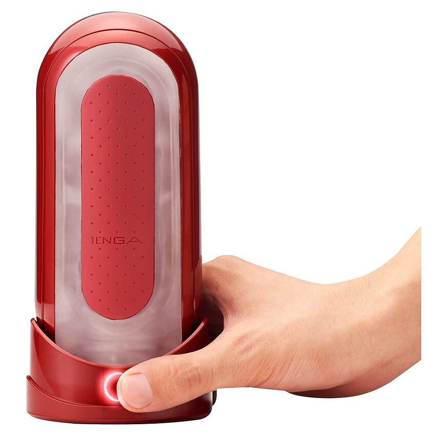Set Tenga FLIP 0 Red cu încălzitor FLIP WARMER: cilindru din gel moale cu texturi dense, încălzire în 5–6 minute, două trepte, design pliabil pentru curățare facilă și suport pentru uscare. Conține adaptor, carcasă și 2 mostre lubrifiant.