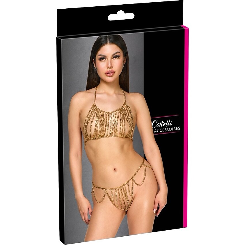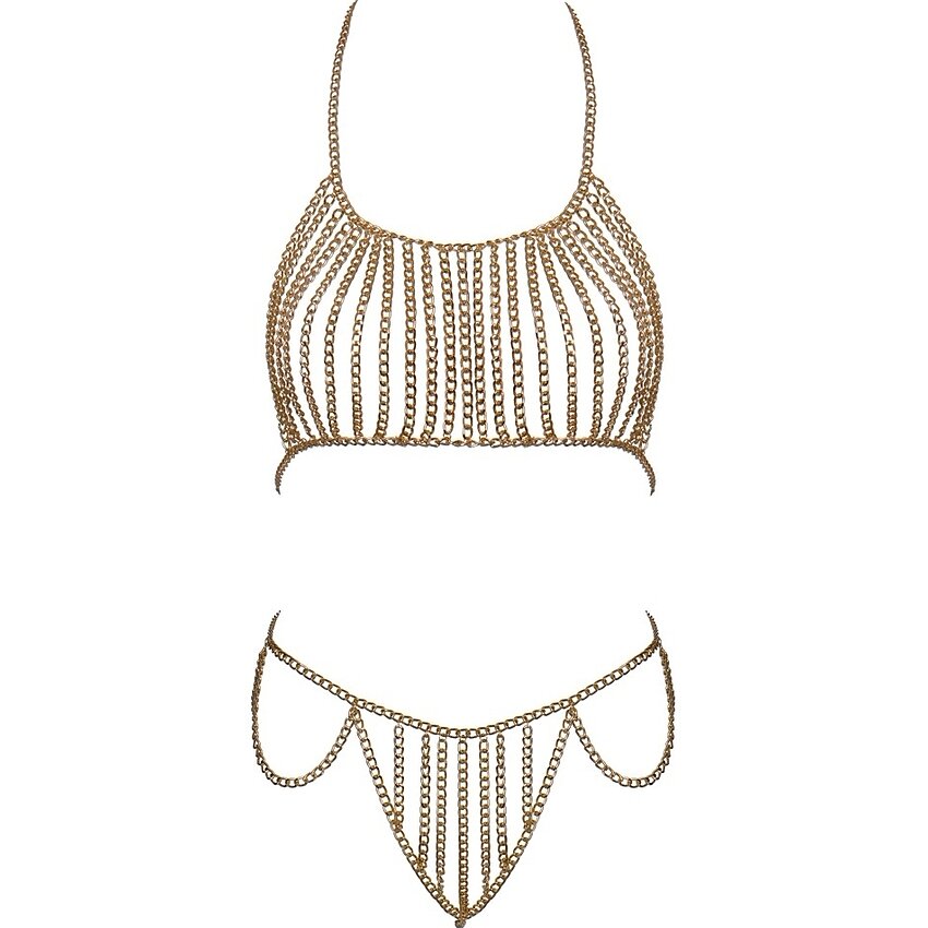 Set din lanț metalic auriu: top halter și string cu decorațiuni pe bust, talie și șolduri. Lanțurile se reglează cu carabiniere; se poartă singur ca accesoriu senzual sau combinat cu costume de baie și ținute mulate.