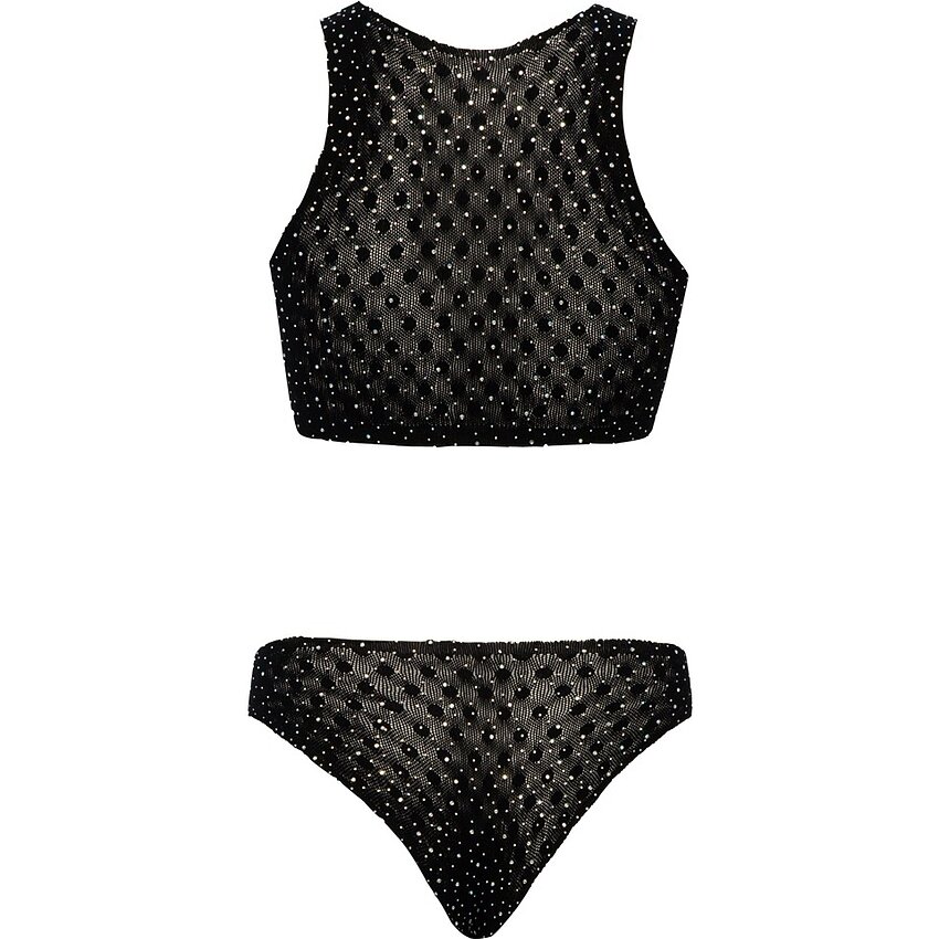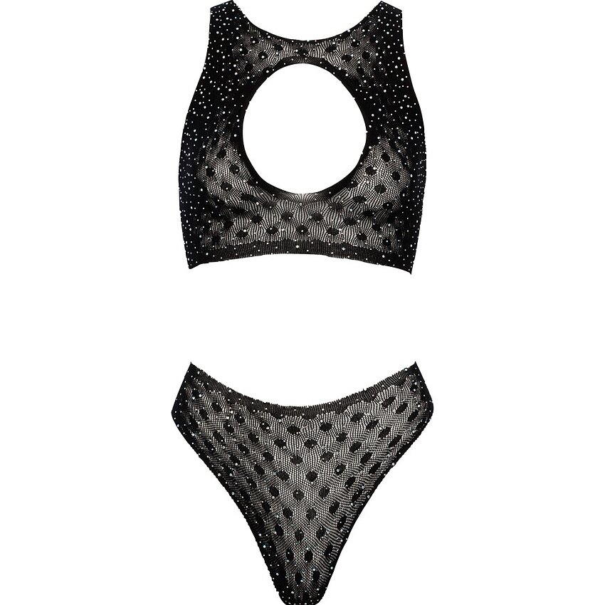 Set Fantezie Cottelli: top semitransparent cu decupaj la decolteu şi tanga, ambele acoperite cu strasuri mari. Material elastic, fără cusături evidente, cumplit de confortabil. Lungime universală S-L. Compoziţie: 93% poliamidă, 7% elastan.