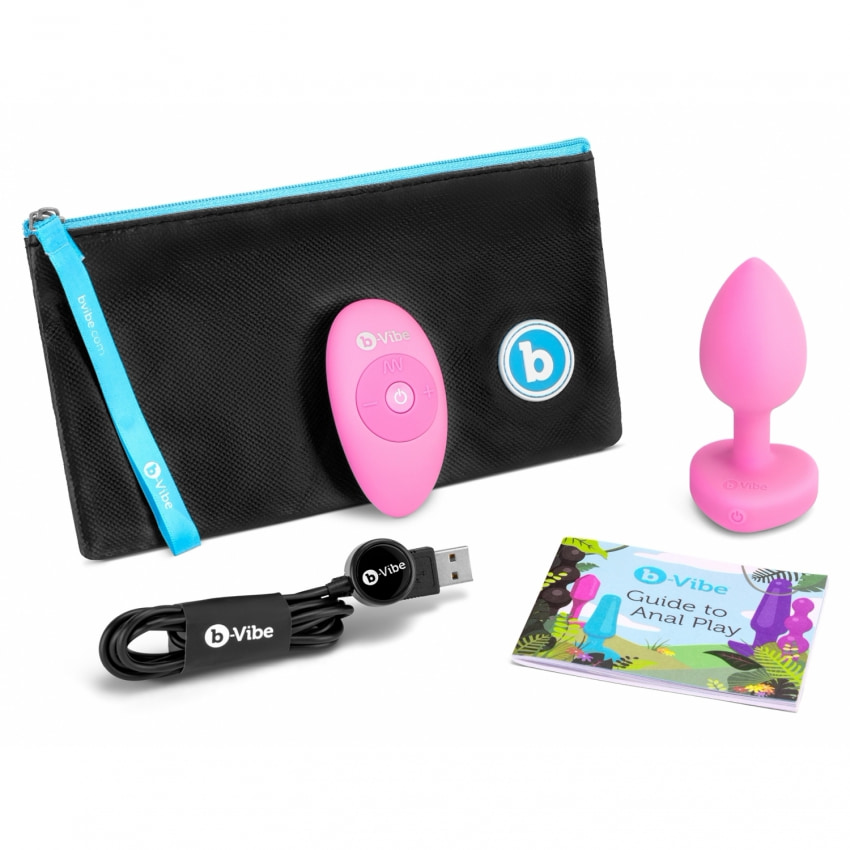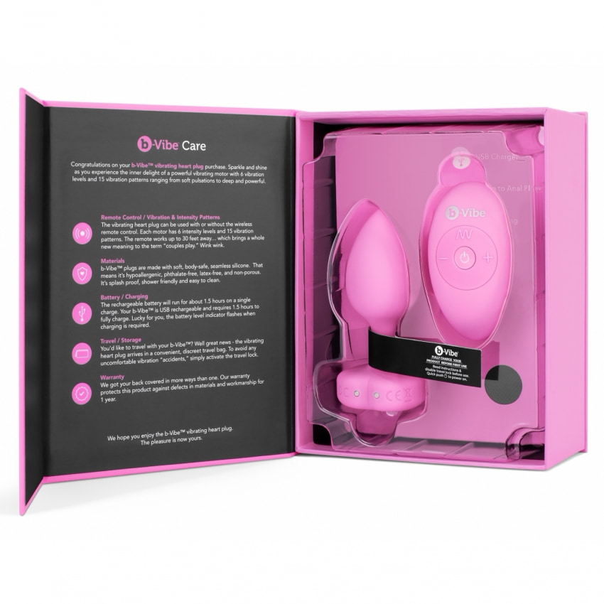 Plug anal b-Vibe cu aspect în inimă și ornament strălucitor. 15 maniere de vibrație, 6 nivele de intensitate, telecomandă discretă și încărcare USB. Silicon catifelat, bază largă pentru siguranță, până la 1.5 ore autonomie. Rezistent la apă; geantă antibacteriană inclusă.