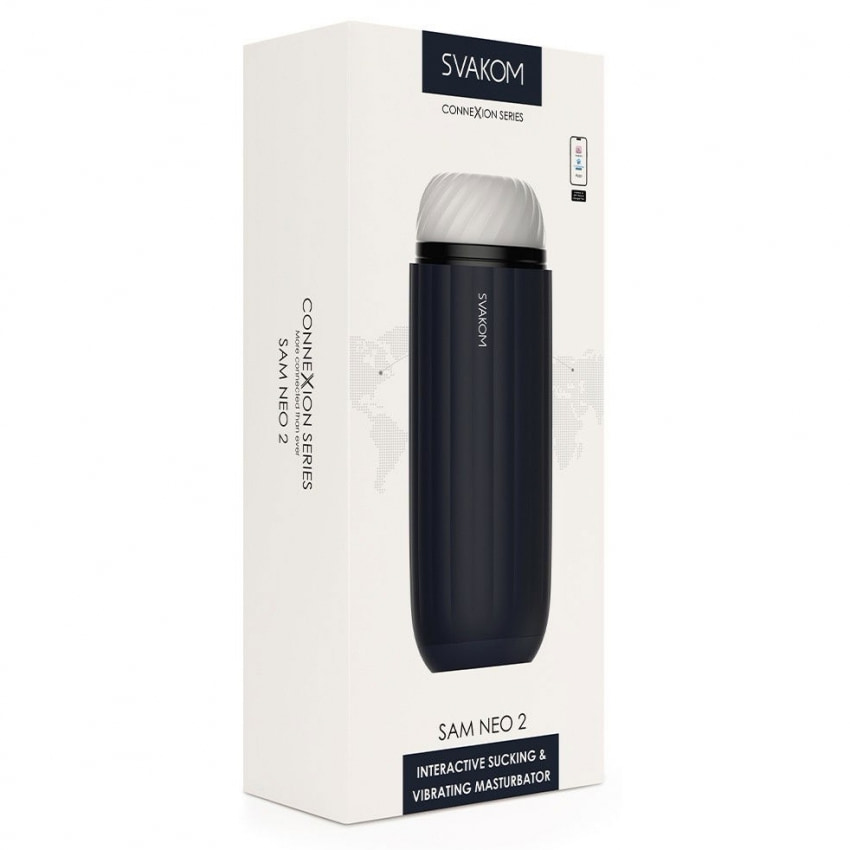 Sam Neo 2 de la Svakom, aparat compact cu 15 moduri (5 suctiune, 5 vibraţie, 5 combinate), funcţie Extended O, control Bluetooth prin aplicaţie, manson detaşabil din TPE, USB cu acumulator şi blocare pentru transport.