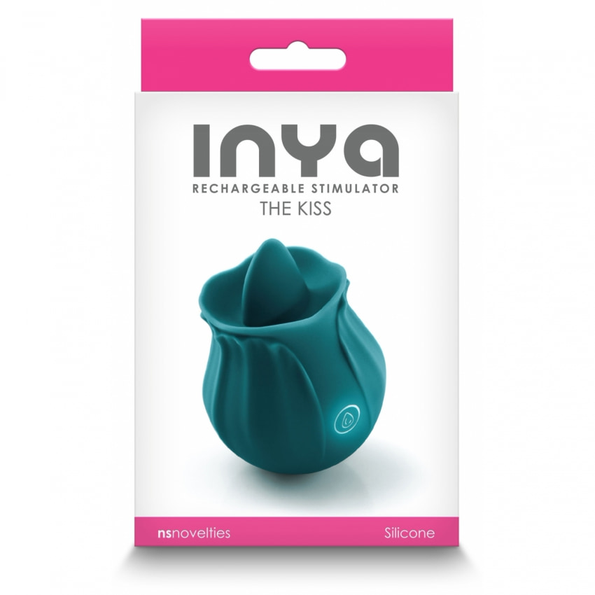 Stimulant clitoridian compact INYA The Kiss, design boboc de trandafir, din silicon moale. Vibrații rapide, concentrate pe clitoris, cu acumulator Li‑Ion (încărcare completă: 75 min). Mărimi compacte: 7.8 x 5.7 cm, ideal pentru portabilitate.